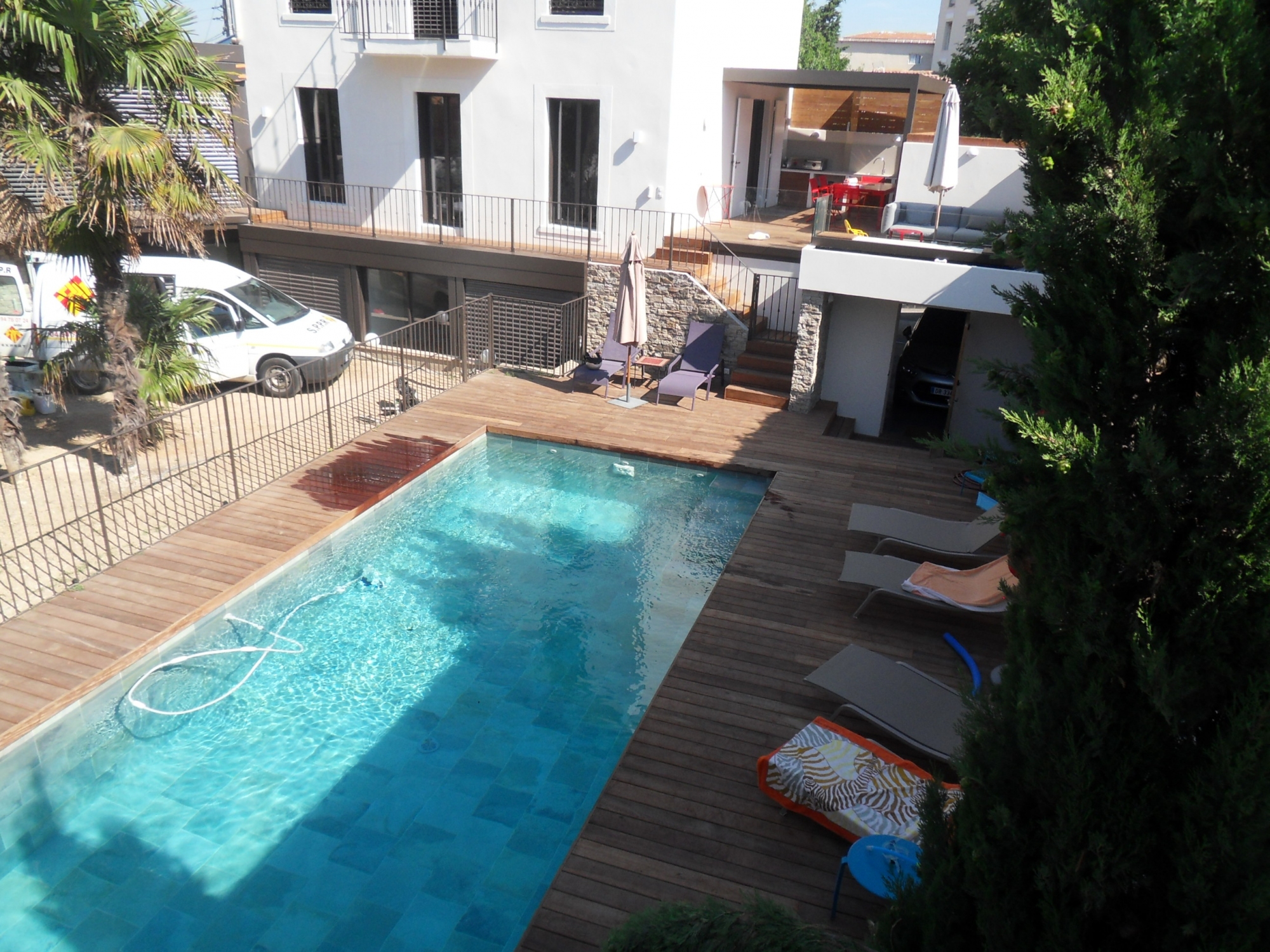 Réalisation d’un aménagement extérieur avec création d’une plage de piscine et de terrasses en bois.