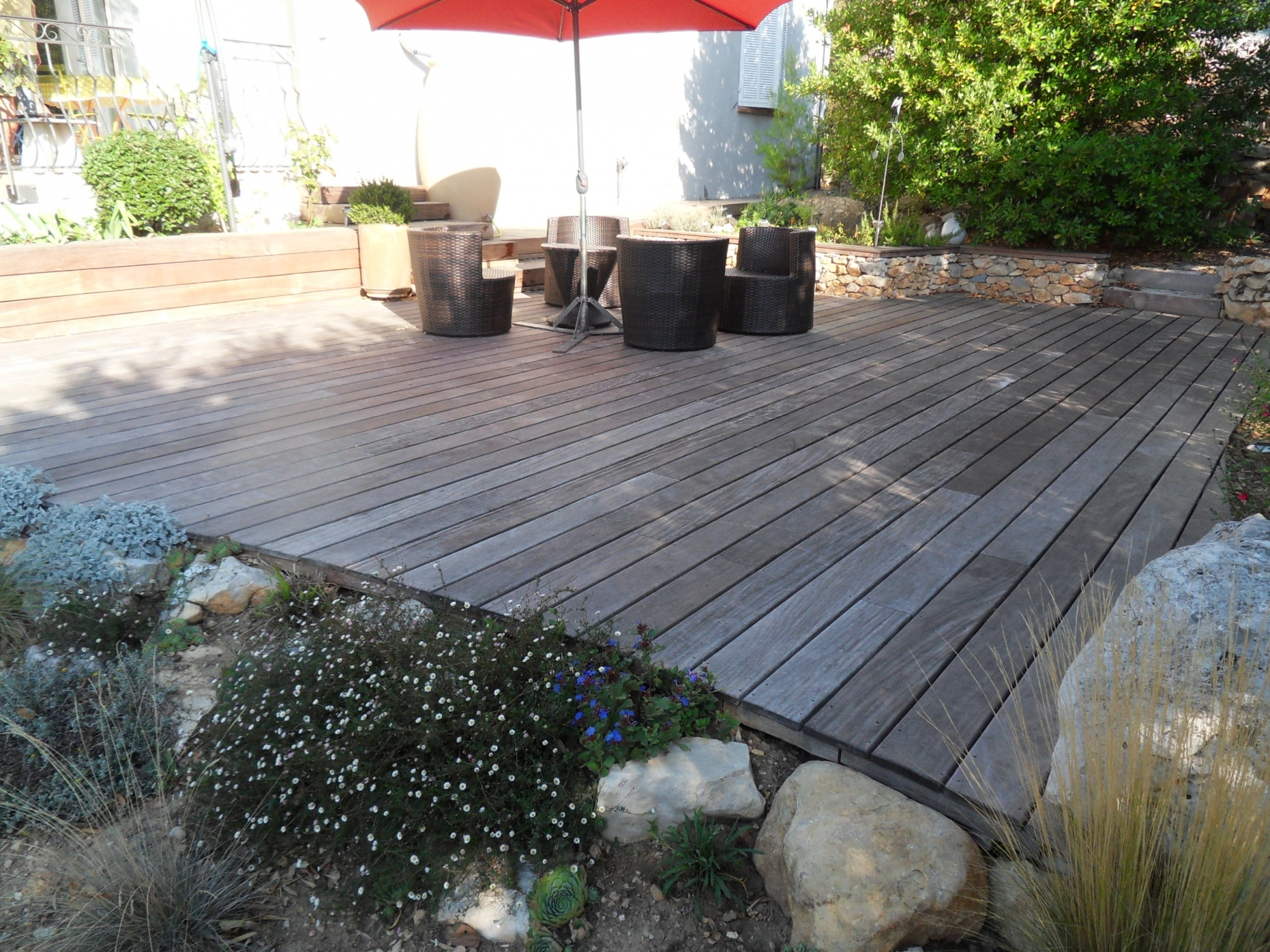 Si vous faites le choix que votre terrasse garde sa couleur, le bois a besoin d'un saturateur à appliquer 2 fois par an.