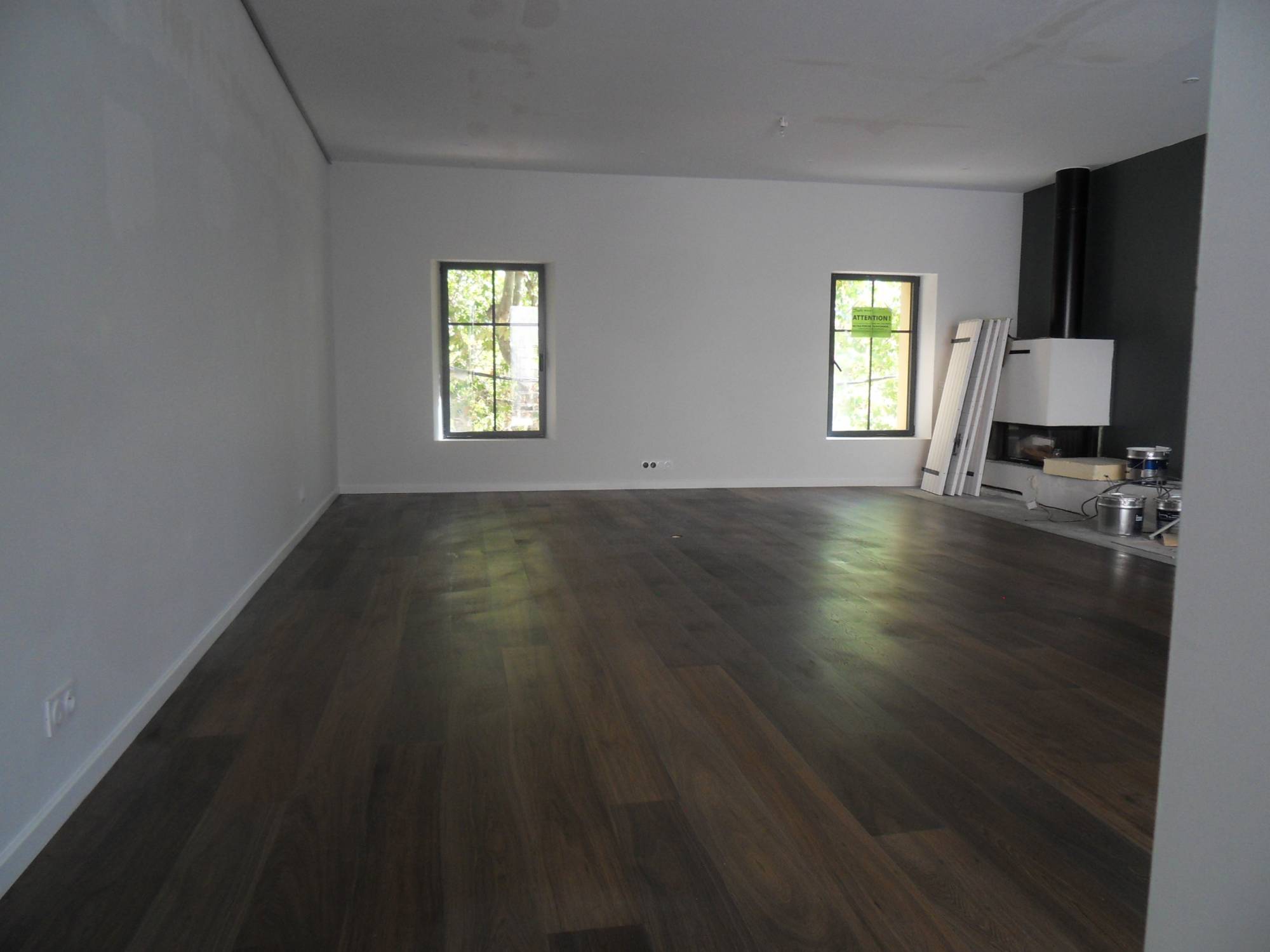 La pose collée sur un ancien carrelage donne tout le confort nécessaire à ce séjour de 40 m2 environ.