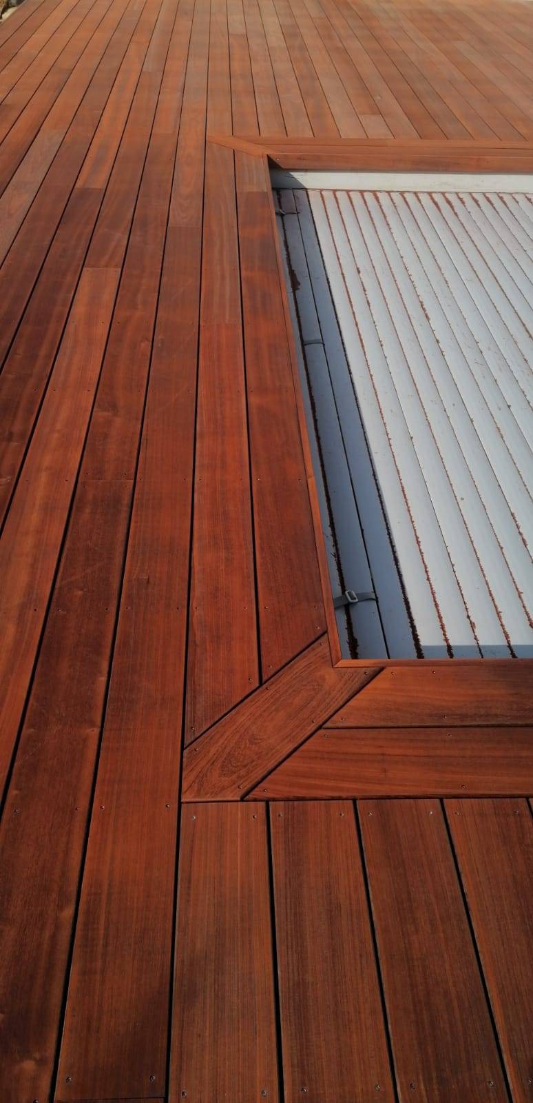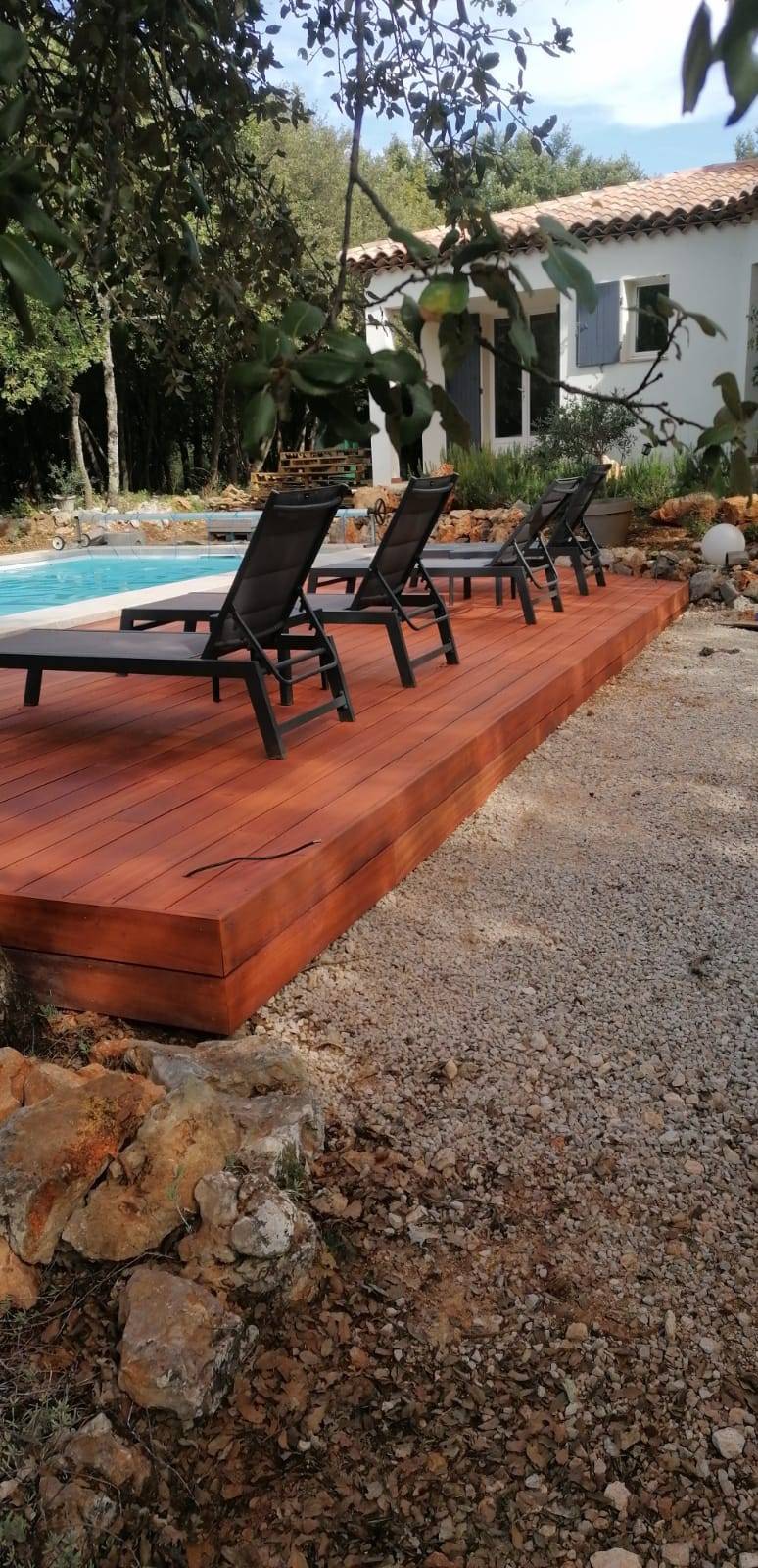 La nature très stable du Padouk et sa durabilité, lui permet d'être posé aussi bien en terrasse qu'autour d'une piscine.