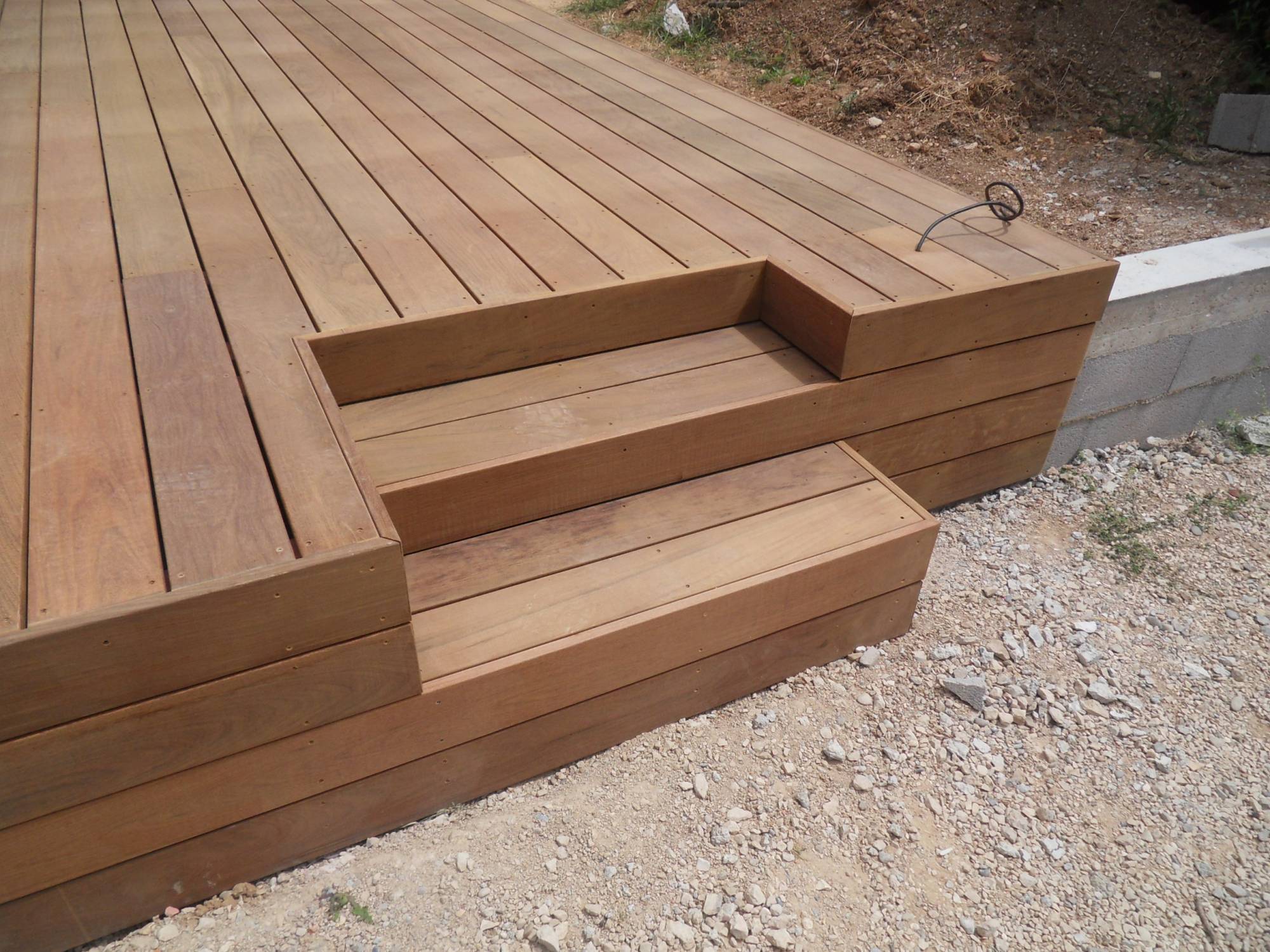 Terrasse sur sol compacté avec plots réglables et double lambourdage en lambourde exotique.