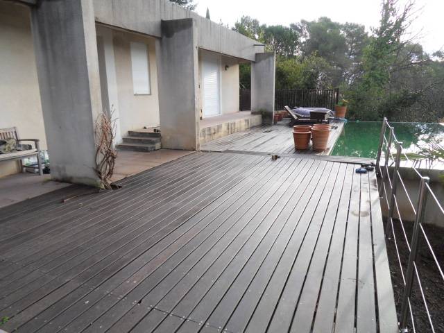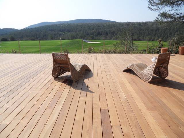 Augmentation de surface utile par la création d'une terrasse bois sur pilotis au Golf de Barbaroux à Brignoles dans le Var. Structure et poutraison en surplomb du relief accidenté qui a permis de tripler la surface existante.