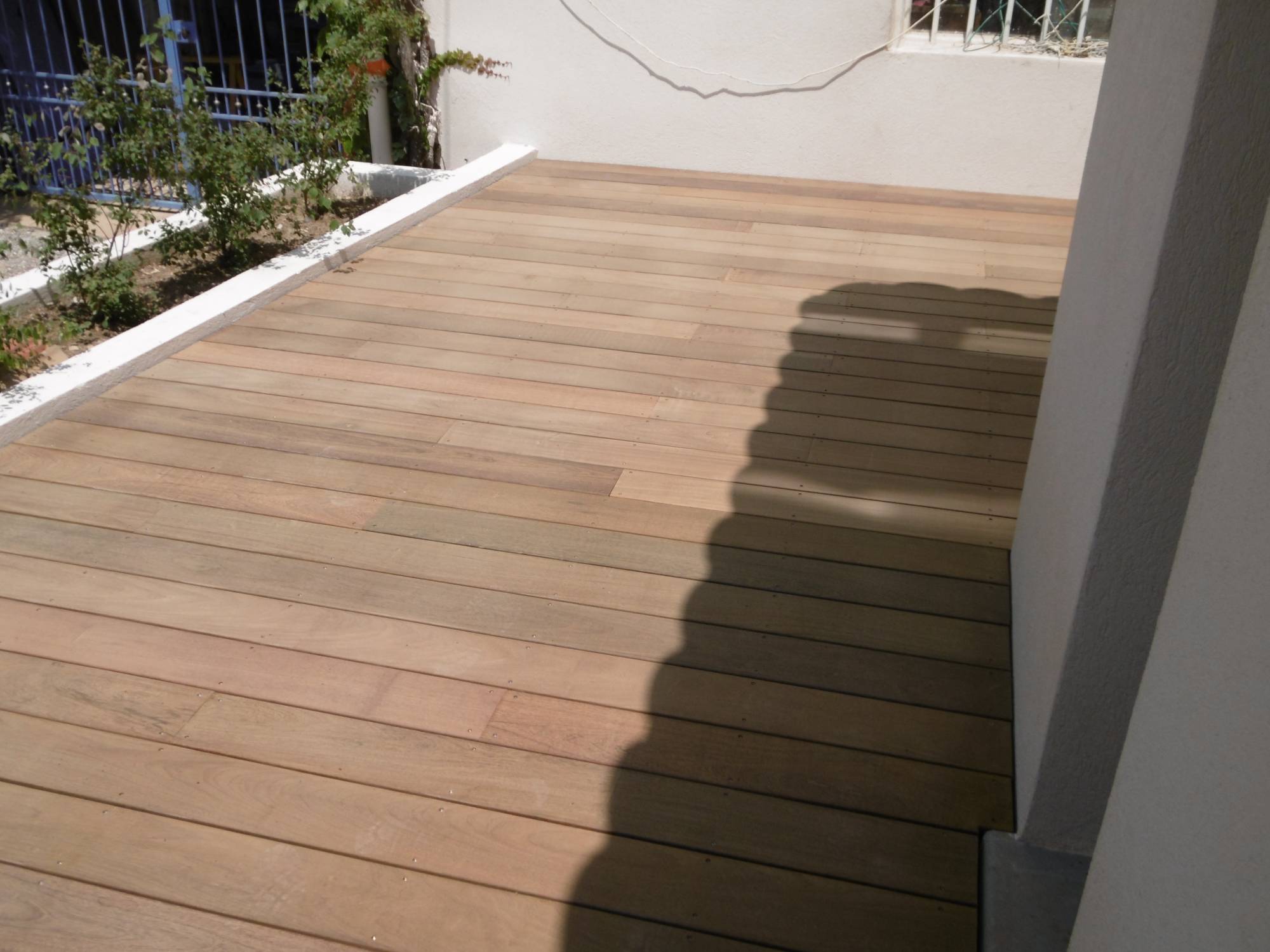 Ici, nous avons posé des lames IPE sur lambourdes en bois exotique à l'intérieur et prolongé au même niveau la terrasse extérieure avec les mêmes lames en IPE,